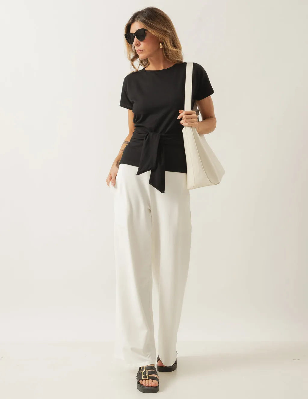 Made from moletinho fabric with elastane, it’s comfortable yet structured, allowing you to feel polished without effort. The round neckline brings balance, while the short sleeves keep it practical for all-day wear.