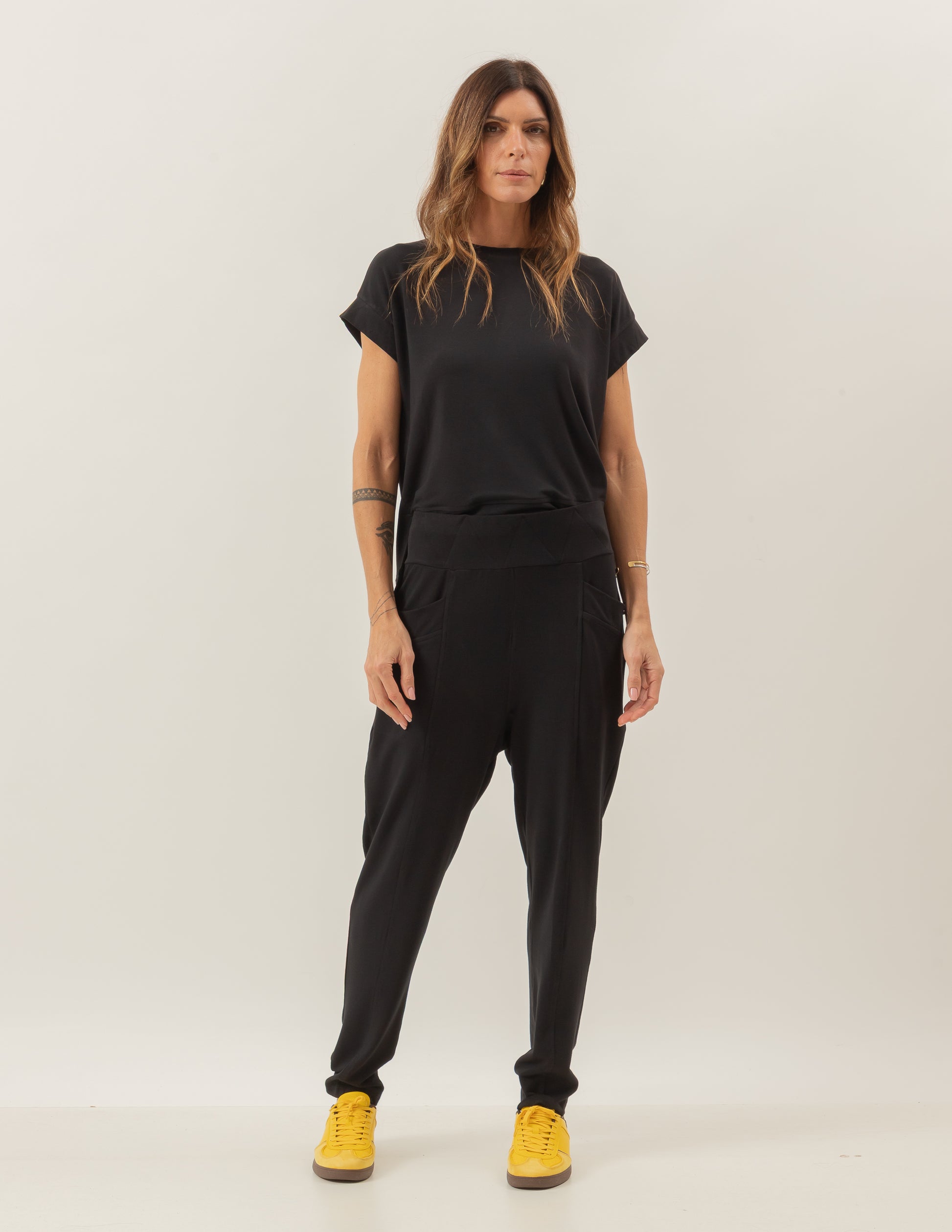 The carrot-cut trousers deliver sophistication with high-waist fit, tapered cut, and practical pockets that make it as functional as it is chic. Together, they create a clean, elongated silhouette that flatters every shape.
