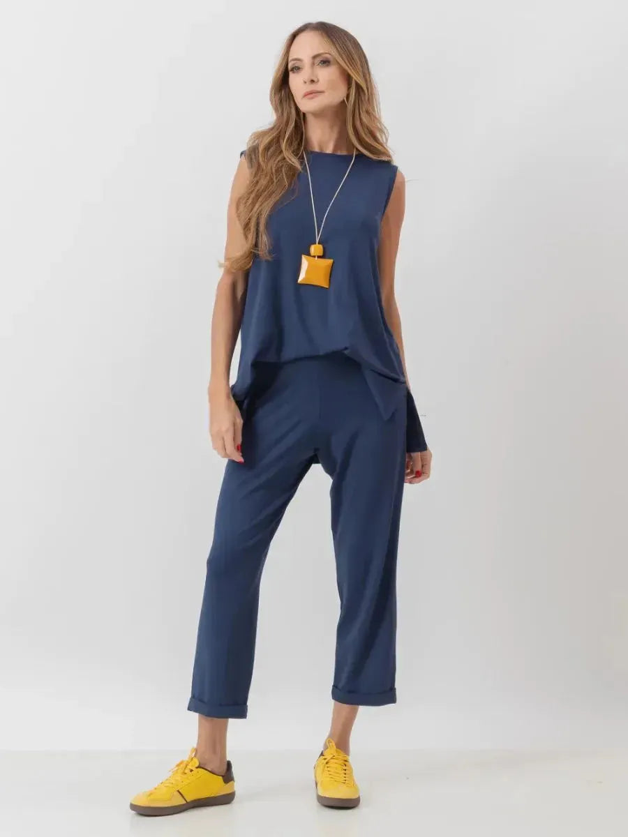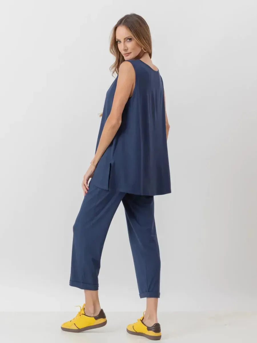 The long tank top is tailored with a clean silhouette that flatters the neckline and shoulders, while the straight-leg high-waisted pants elongate the figure with flow and elegance. An elastic waistband ensures a secure, comfortable fit all day long.