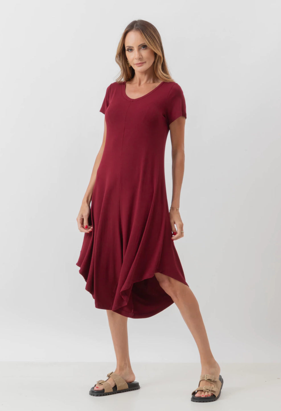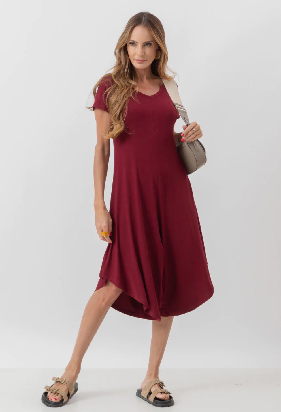 Its asymmetrical rounded hemline adds flow and modernity, while the viscose-elastane blend ensures comfort and a flattering fit. The loose cut makes it practical and stylish, while the one-size design adapts comfortably to sizes 38–44 (US 6–12).