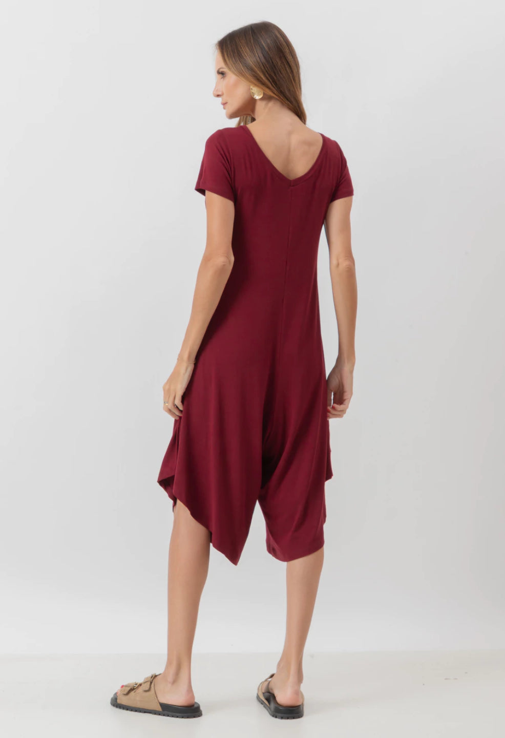 The Heloísa Asymmetrical Burgundy Jumpsuit offers a perfect mix of classic elegance and bold personality. With its pantacourt silhouette, round neckline, and short sleeves, it is both versatile and sophisticated.