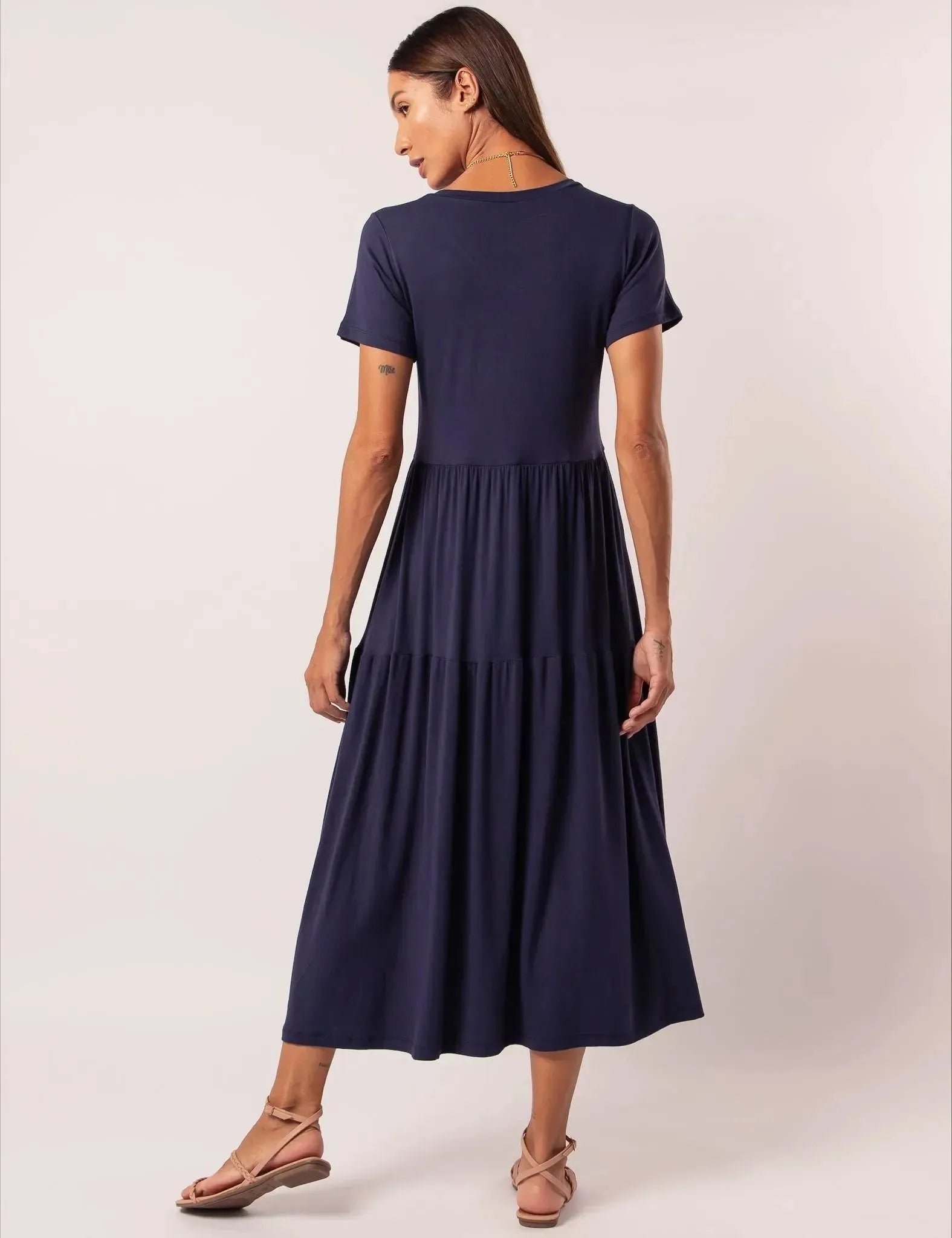 Its V-neckline with bias trim brings a touch of sophistication to the design, while the midi length strikes the perfect balance between practicality and refined style. The loose fit ensures freedom of movement, making this dress a true staple for any wardrobe.