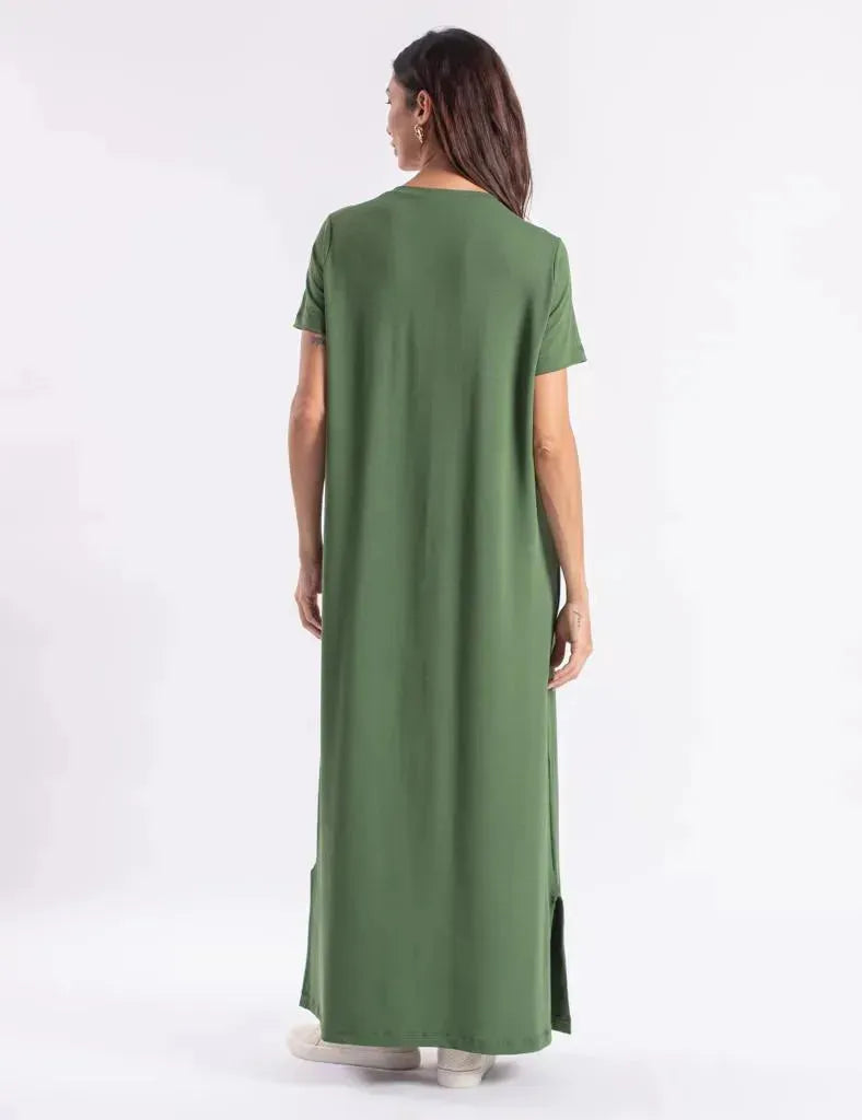 The Paolla Military Green Dress combines urban chic with feminine charm. Crafted from a soft viscose blend (80% viscose, 20% elastane), it ensures breathability, elasticity, and a smooth drape that complements movement.
